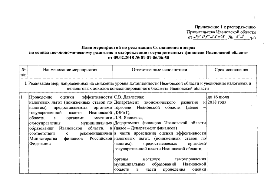 Распоряжение Правительства Ивановской области от 21.05.2018 N 63-рп "О реализации Соглашения о мерах по социально-экономическому развитию и оздоровлению государственных финансов Ивановской области" (вместе с "Планом мероприятий по реализации Соглашения о мерах по социально-экономическому развитию и оздоровлению государственных финансов Ивановской области от 09.02.2018 N 01-01-06/06-50")