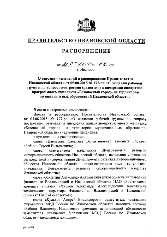 Распоряжение Правительства Ивановской области от 21.05.2018 N 62-рп "О внесении изменений в распоряжение Правительства Ивановской области от 05.08.2015 N 177-рп "О создании рабочей группы по вопросу построения (развития) и внедрения аппаратно-программного комплекса "Безопасный город" на территории муниципальных образований Ивановской области"