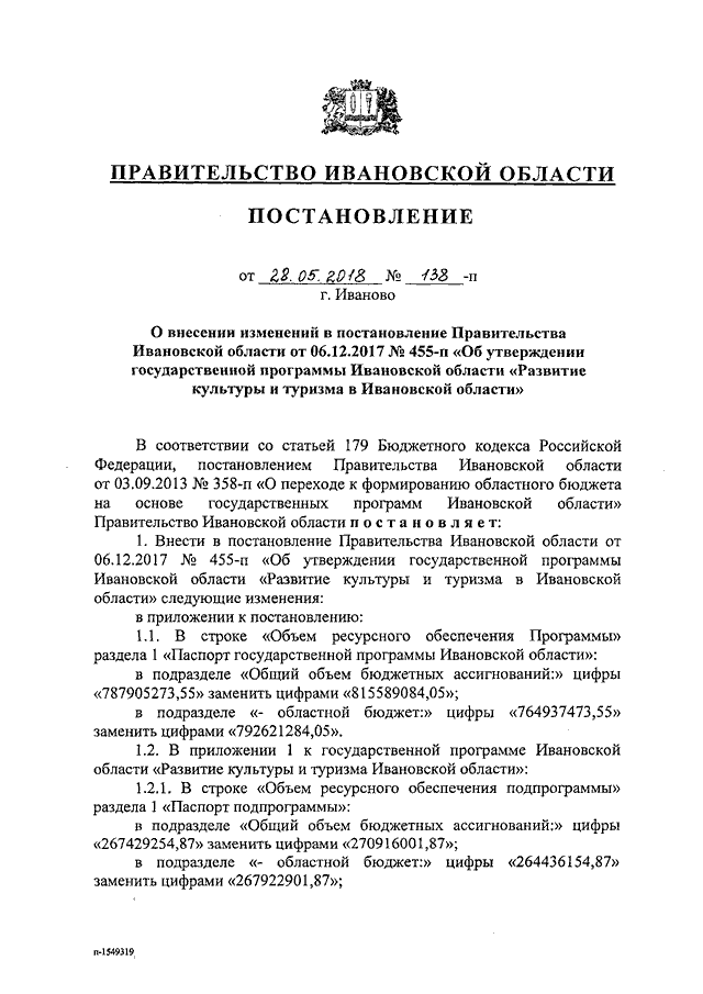 Постановление Правительства Ивановской области от 28.05.2018 N 138-п "О внесении изменений в постановление Правительства Ивановской области от 06.12.2017 N 455-п "Об утверждении государственной программы Ивановской области "Развитие культуры и туризма в Ивановской области"