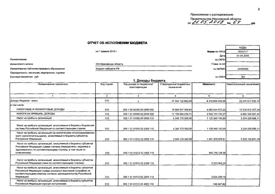 Распоряжение Правительства Ивановской области от 21.05.2018 N 64-рп "Об утверждении отчета об исполнении областного бюджета за I квартал 2018 года"