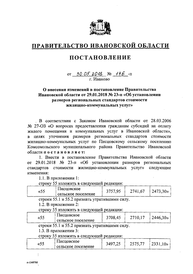 Постановление Правительства Ивановской области от 30.05.2018 N 146-п "О внесении изменений в постановление Правительства Ивановской области от 29.01.2018 N 23-п "Об установлении размеров региональных стандартов стоимости жилищно-коммунальных услуг"