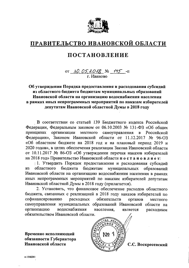 Постановление Правительства Ивановской области от 30.05.2018 N 145-п "Об утверждении Порядка предоставления и расходования субсидий из областного бюджета бюджетам муниципальных образований Ивановской области на организацию водоснабжения населения в рамках иных непрограммных мероприятий по наказам избирателей депутатам Ивановской областной Думы в 2018 году"