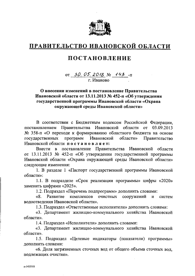 Постановление Правительства Ивановской области от 30.05.2018 N 143-п "О внесении изменений в постановление Правительства Ивановской области от 13.11.2013 N 452-п "Об утверждении государственной программы Ивановской области "Охрана окружающей среды Ивановской области" (вместе с "Подпрограммой "Развитие комплексов очистных сооружений и систем водоотведения Ивановской области")