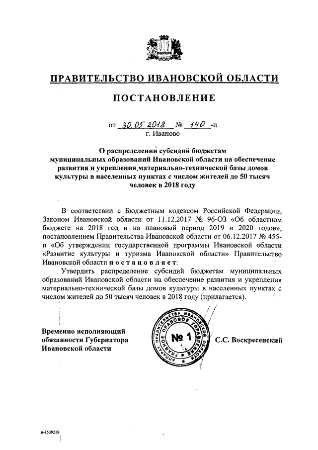 Постановление Правительства Ивановской области от 30.05.2018 N 140-п "О распределении субсидий бюджетам муниципальных образований Ивановской области на обеспечение развития и укрепления материально-технической базы домов культуры в населенных пунктах с числом жителей до 50 тысяч человек в 2018 году"