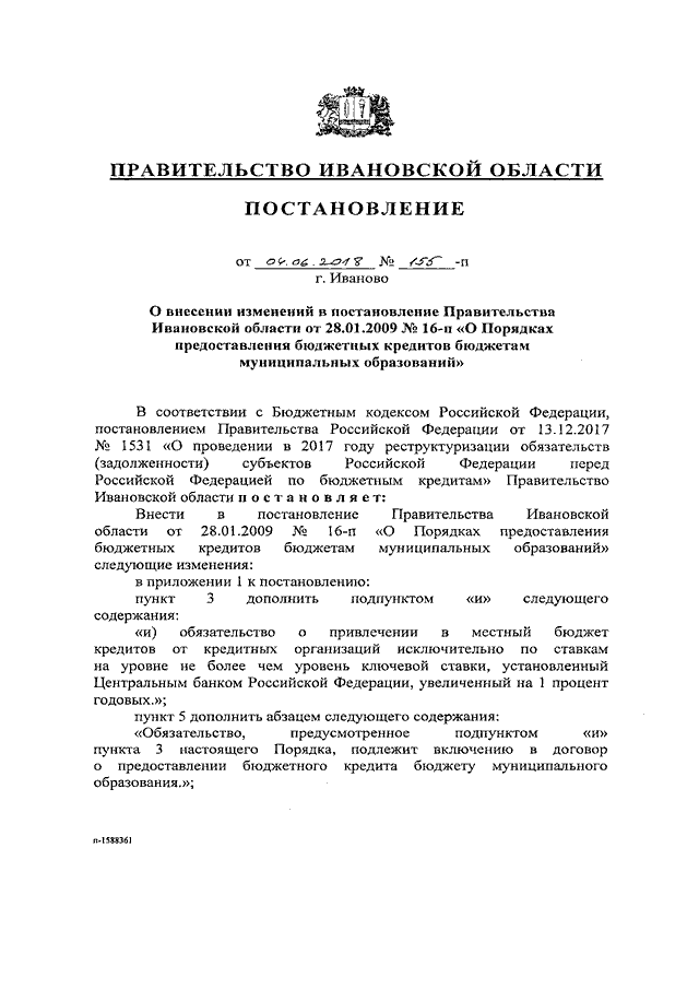 Постановление Правительства Ивановской области от 04.06.2018 N 155-п "О внесении изменений в постановление Правительства Ивановской области от 28.01.2009 N 16-п "О Порядках предоставления бюджетных кредитов бюджетам муниципальных образований"