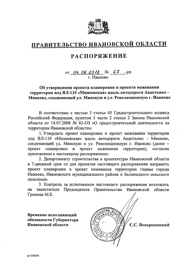 Распоряжение Правительства Ивановской области от 04.06.2018 N 67-рп "Об утверждении проекта планировки и проекта межевания территории под ВЛ-110 "Минеевская" вдоль автодороги Авдотьино - Минеево, соединяющей ул. Минскую и ул. Революционную г. Иваново"