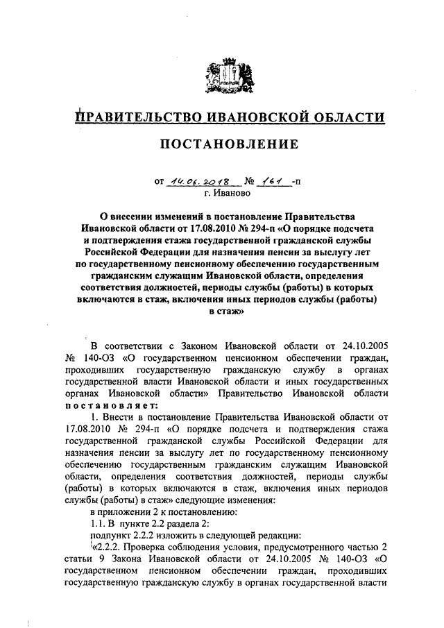 Постановление Правительства Ивановской области от 14.06.2018 N 161-п "О внесении изменений в постановление Правительства Ивановской области от 17.08.2010 N 294-п "О порядке подсчета и подтверждения стажа государственной гражданской службы Российской Федерации для назначения пенсии за выслугу лет по государственному пенсионному обеспечению государственным гражданским служащим Ивановской области, определения соответствия должностей, периоды службы (работы) в которых включаются в стаж, включения иных периодов службы (работы) в стаж"