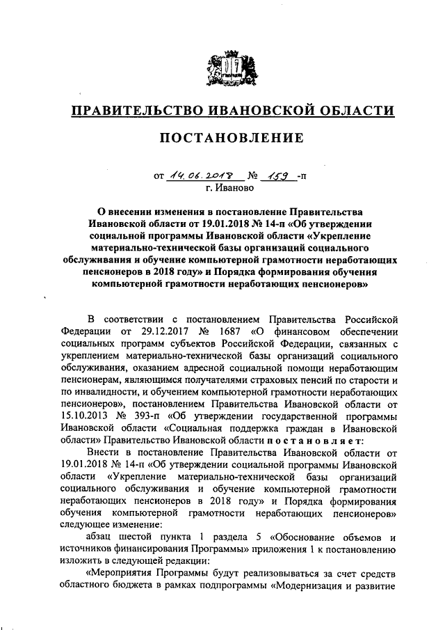 Постановление Правительства Ивановской области от 14.06.2018 N 159-п "О внесении изменения в постановление Правительства Ивановской области от 19.01.2018 N 14-п "Об утверждении социальной программы Ивановской области "Укрепление материально-технической базы организаций социального обслуживания и обучение компьютерной грамотности неработающих пенсионеров в 2018 году" и Порядка формирования обучения компьютерной грамотности неработающих пенсионеров"
