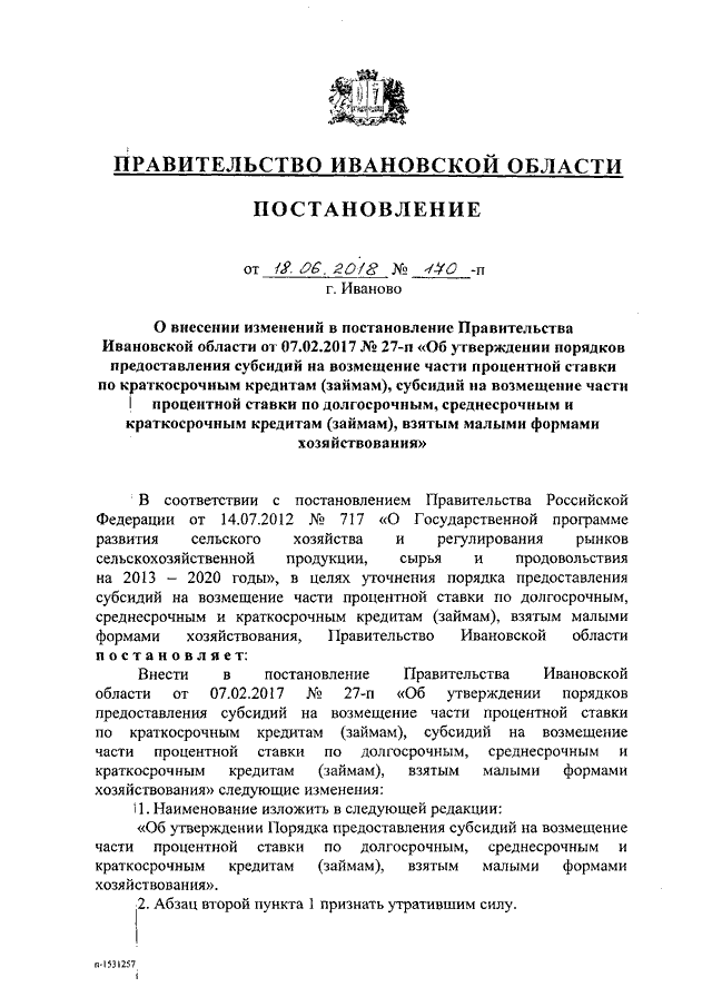 Постановление Правительства Ивановской области от 18.06.2018 N 170-п "О внесении изменений в постановление Правительства Ивановской области от 07.02.2017 N 27-п "Об утверждении порядков предоставления субсидий на возмещение части процентной ставки по краткосрочным кредитам (займам), субсидий на возмещение части процентной ставки по долгосрочным, среднесрочным и краткосрочным кредитам (займам), взятым малыми формами хозяйствования"