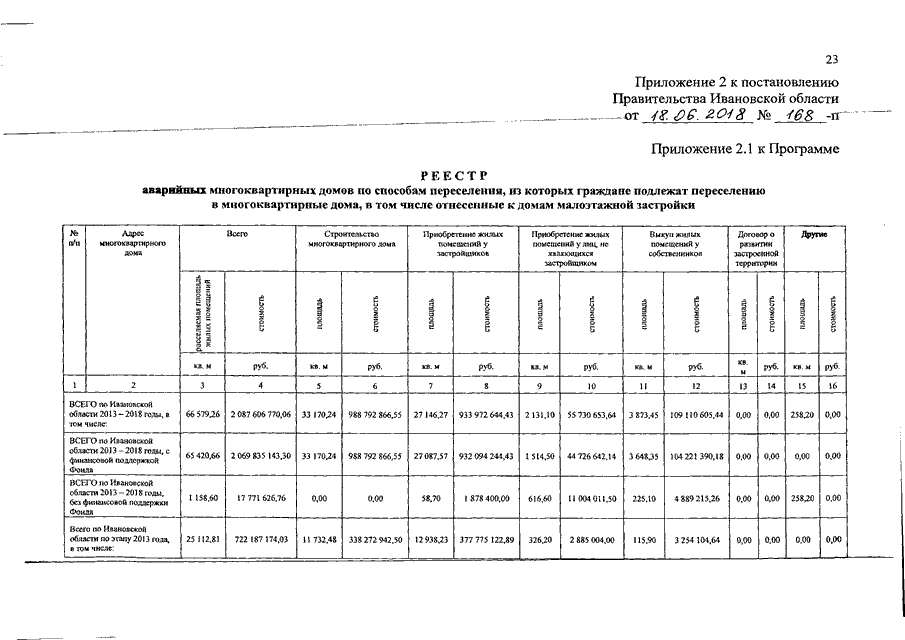 Постановление Правительства Ивановской области от 18.06.2018 N 168-п "О внесении изменений в постановление Правительства Ивановской области от 15.04.2013 N 134-п "Об утверждении региональной адресной программы "Переселение граждан из аварийного жилищного фонда на территории Ивановской области на 2013 - 2017 годы" (вместе с "Перечнем аварийных многоквартирных домов, из которых граждане подлежат переселению в многоквартирные дома, в том числе отнесенные к домам малоэтажной застройки", "Реестром аварийных многоквартирных домов по способам переселения, из которых граждане подлежат переселению в многоквартирные дома, в том числе отнесенные к домам малоэтажной застройки", "Порядком предоставления и расходования субсидии бюджету Савинского городского поселения на достройку жилого дома в поселке Савино в 2018 году")
