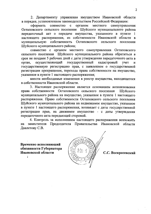 Распоряжение Правительства Ивановской области от 13.06.2018 N 69-рп "О передаче имущества из собственности Ивановской области в муниципальную собственность Остаповского сельского поселения Шуйского муниципального района"