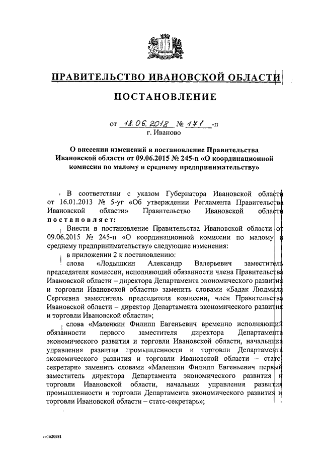 Постановление Правительства Ивановской области от 18.06.2018 N 171-п "О внесении изменений в постановление Правительства Ивановской области от 09.06.2015 N 245-п "О координационной комиссии по малому и среднему предпринимательству"