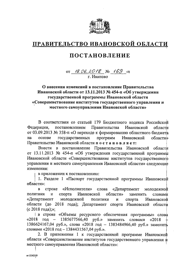 Постановление Правительства Ивановской области от 18.06.2018 N 169-п "О внесении изменений в постановление Правительства Ивановской области от 13.11.2013 N 454-п "Об утверждении государственной программы Ивановской области "Совершенствование институтов государственного управления и местного самоуправления Ивановской области"