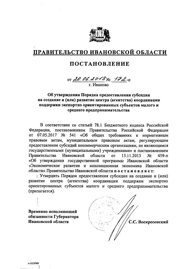 Постановление Правительства Ивановской области от 20.06.2018 N 172-п "Об утверждении Порядка предоставления субсидии на создание и (или) развитие центра (агентства) координации поддержки экспортно ориентированных субъектов малого и среднего предпринимательства"
