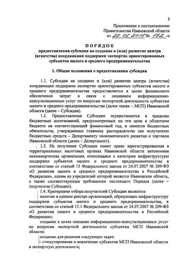 Постановление Правительства Ивановской области от 20.06.2018 N 172-п "Об утверждении Порядка предоставления субсидии на создание и (или) развитие центра (агентства) координации поддержки экспортно ориентированных субъектов малого и среднего предпринимательства"