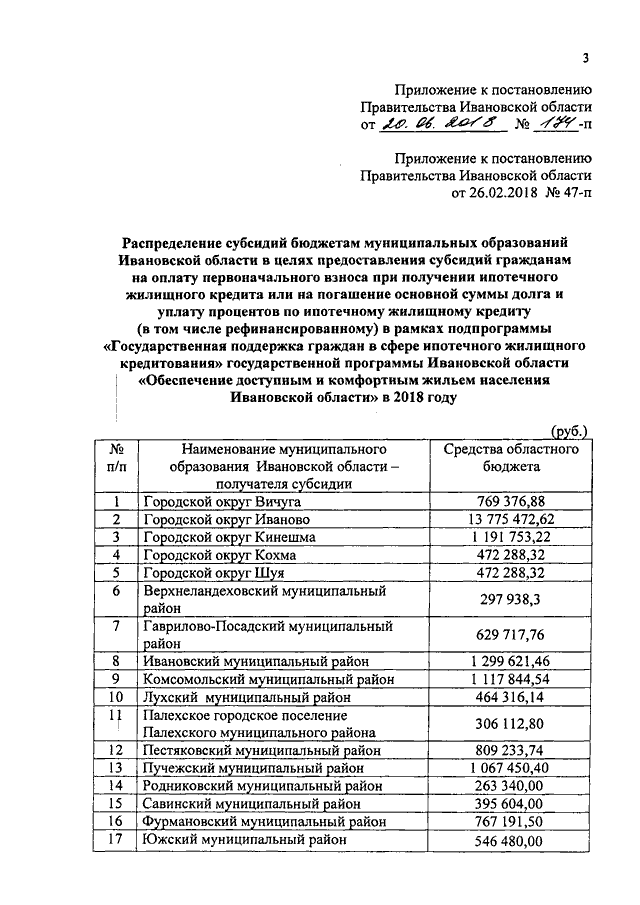 Постановление Правительства Ивановской области от 20.06.2018 N 174-п "О внесении изменения в постановление Правительства Ивановской области от 26.02.2018 N 47-п "О распределении субсидий бюджетам муниципальных образований Ивановской области в целях предоставления субсидий гражданам на оплату первоначального взноса при получении ипотечного жилищного кредита или на погашение основной суммы долга и уплату процентов по ипотечному жилищному кредиту (в том числе рефинансированному) в рамках подпрограммы "Государственная поддержка граждан в сфере ипотечного жилищного кредитования" государственной программы Ивановской области "Обеспечение доступным и комфортным жильем населения Ивановской области" в 2018 году"