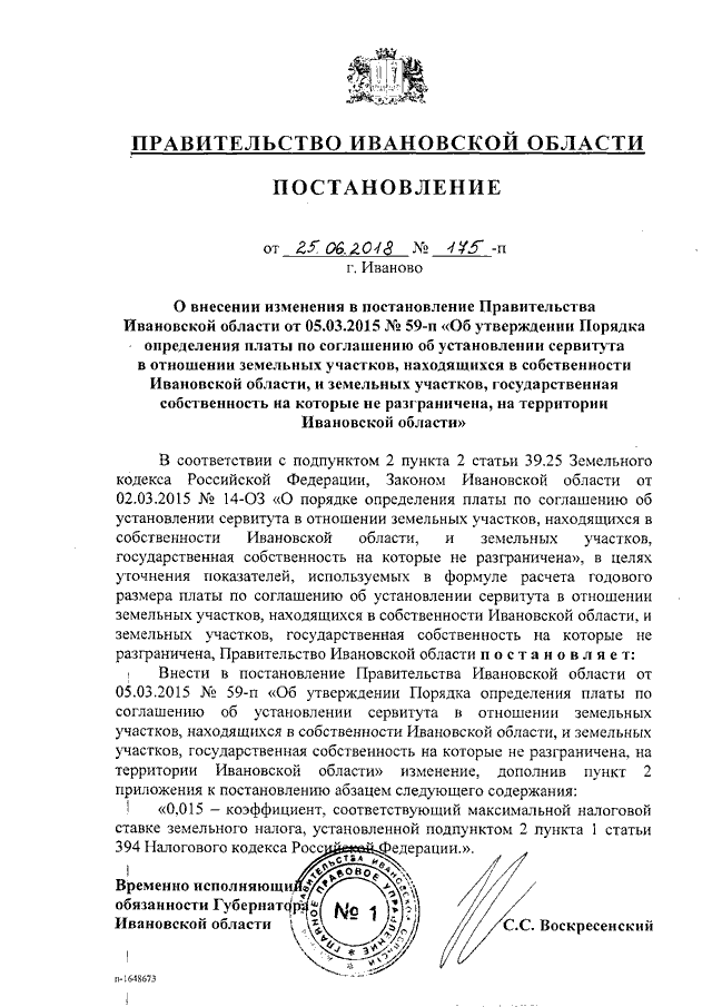 Постановление Правительства Ивановской области от 25.06.2018 N 175-п "О внесении изменения в постановление Правительства Ивановской области от 05.03.2015 N 59-п "Об утверждении Порядка определения платы по соглашению об установлении сервитута в отношении земельных участков, находящихся в собственности Ивановской области, и земельных участков, государственная собственность на которые не разграничена, на территории Ивановской области"