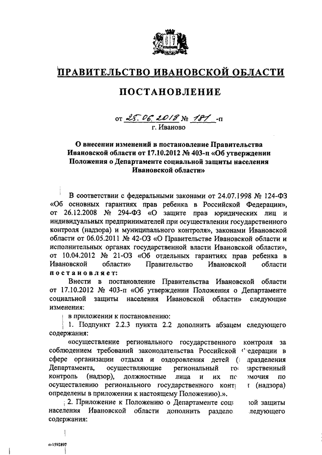 Постановление Правительства Ивановской области от 25.06.2018 N 181-п "О внесении изменений в постановление Правительства Ивановской области от 17.10.2012 N 403-п "Об утверждении Положения о Департаменте социальной защиты населения Ивановской области"