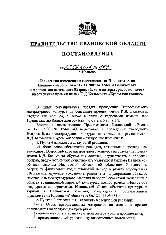 Постановление Правительства Ивановской области от 25.06.2018 N 189-п "О внесении изменений в постановление Правительства Ивановской области от 17.11.2009 N 324-п "О подготовке и проведении ежегодного Всероссийского литературного конкурса на соискание премии имени К.Д. Бальмонта "Будем как солнце"
