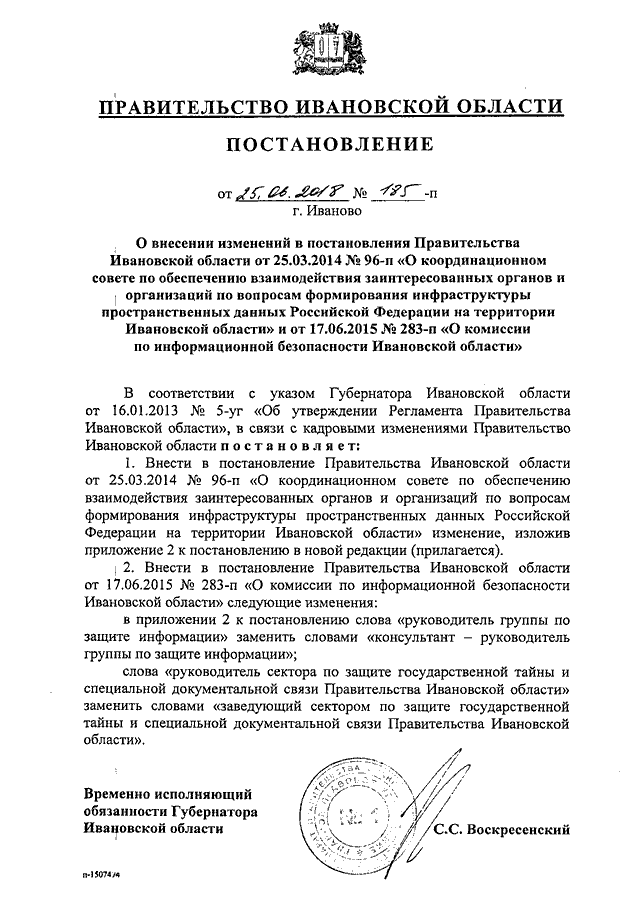 Постановление Правительства Ивановской области от 25.06.2018 N 185-п "О внесении изменений в постановления Правительства Ивановской области от 25.03.2014 N 96-п "О координационном совете по обеспечению взаимодействия заинтересованных органов и организаций по вопросам формирования инфраструктуры пространственных данных Российской Федерации на территории Ивановской области" и от 17.06.2015 N 283-п "О комиссии по информационной безопасности Ивановской области"