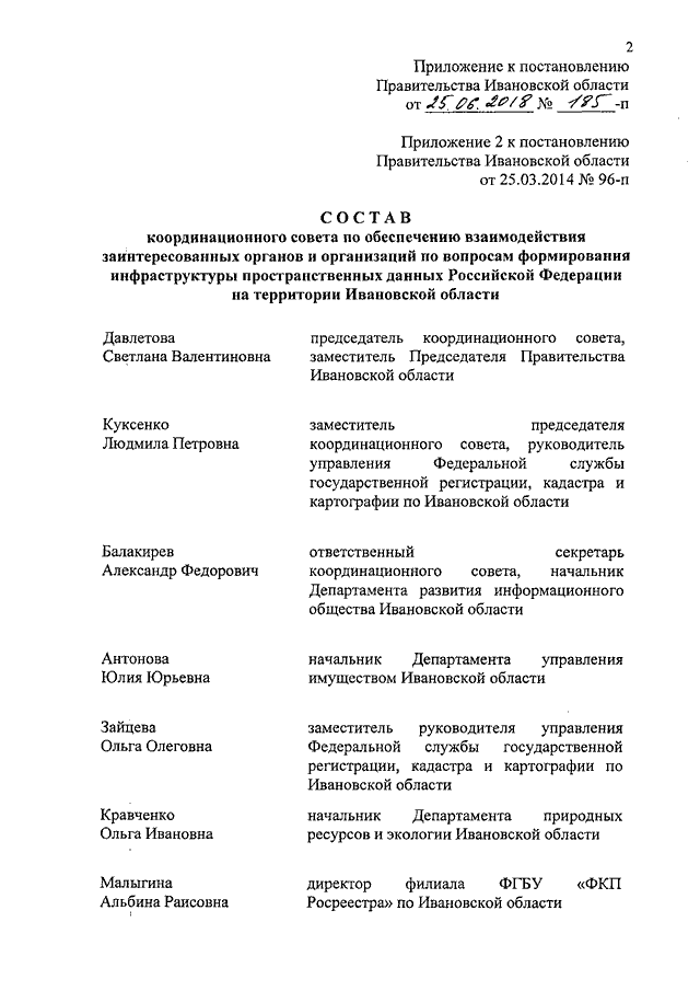 Постановление Правительства Ивановской области от 25.06.2018 N 185-п "О внесении изменений в постановления Правительства Ивановской области от 25.03.2014 N 96-п "О координационном совете по обеспечению взаимодействия заинтересованных органов и организаций по вопросам формирования инфраструктуры пространственных данных Российской Федерации на территории Ивановской области" и от 17.06.2015 N 283-п "О комиссии по информационной безопасности Ивановской области"