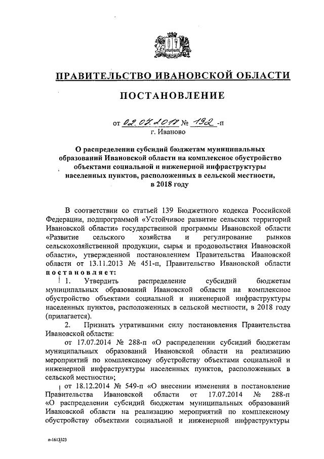 Постановление Правительства Ивановской области от 02.07.2018 N 192-п "О распределении субсидий бюджетам муниципальных образований Ивановской области на комплексное обустройство объектами социальной и инженерной инфраструктуры населенных пунктов, расположенных в сельской местности, в 2018 году"