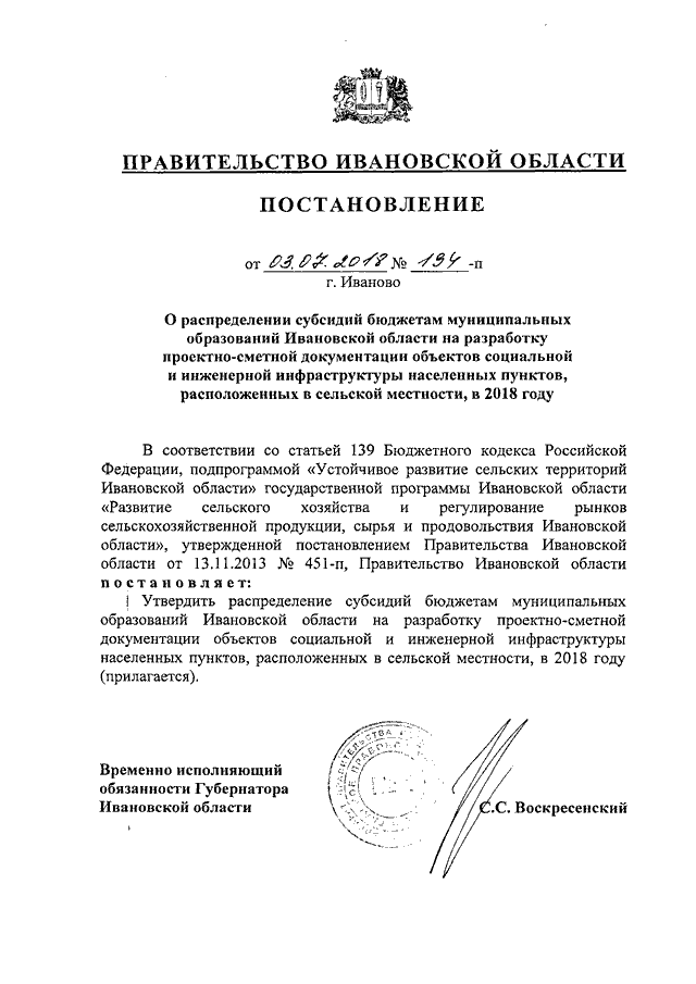 Постановление Правительства Ивановской области от 03.07.2018 N 194-п "О распределении субсидий бюджетам муниципальных образований Ивановской области на разработку проектно-сметной документации объектов социальной и инженерной инфраструктуры населенных пунктов, расположенных в сельской местности, в 2018 году"