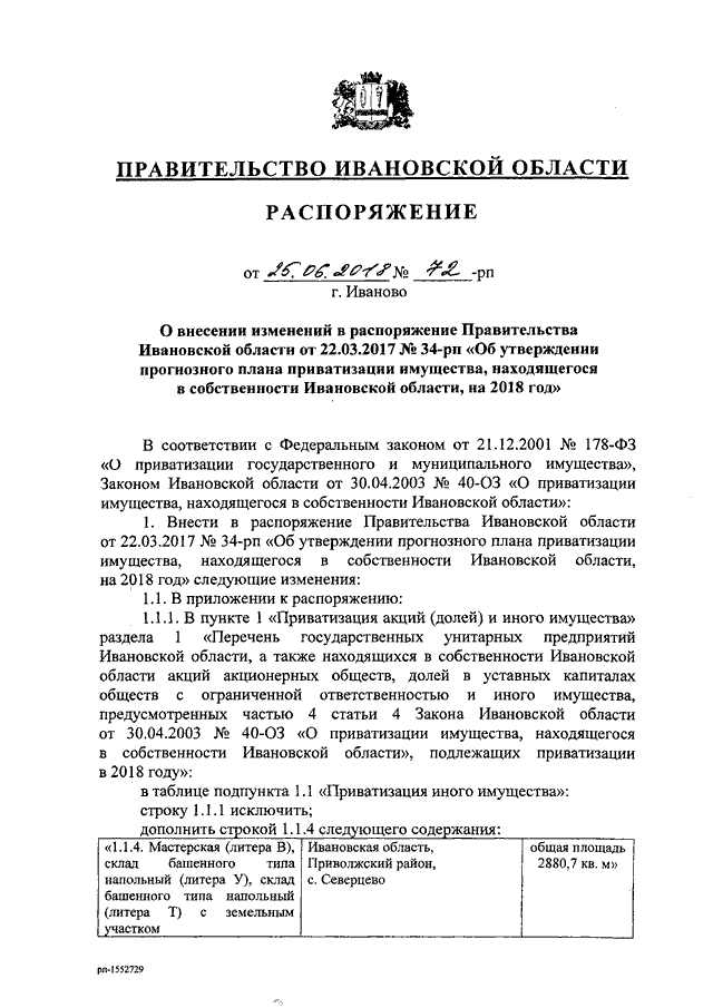 Распоряжение Правительства Ивановской области от 25.06.2018 N 72-рп "О внесении изменений в распоряжение Правительства Ивановской области от 22.03.2017 N 34-рп "Об утверждении прогнозного плана приватизации имущества, находящегося в собственности Ивановской области, на 2018 год"