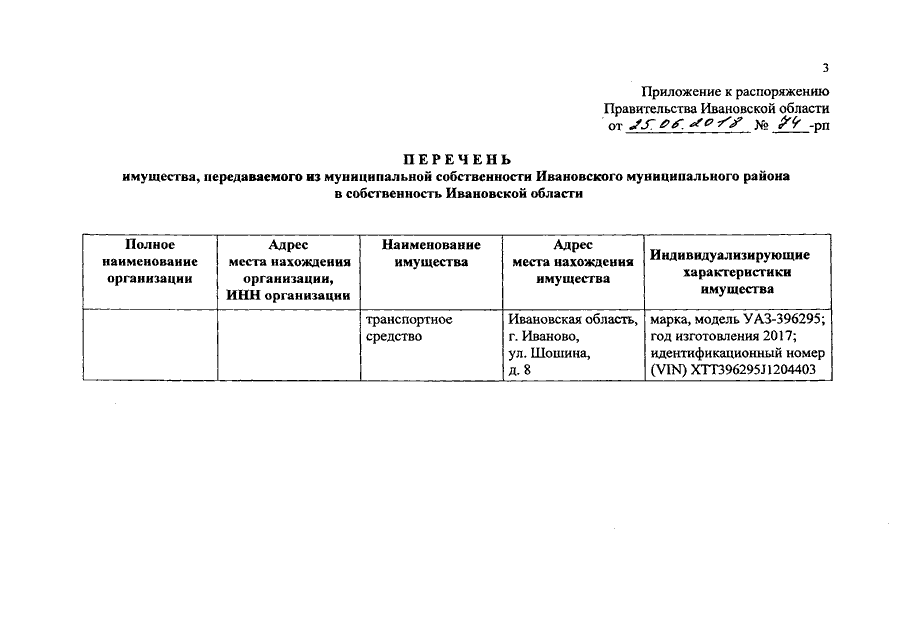 Распоряжение Правительства Ивановской области от 25.06.2018 N 74-рп "О передаче имущества из муниципальной собственности Ивановского муниципального района в собственность Ивановской области" (вместе с "Перечнем имущества, передаваемого из муниципальной собственности Ивановского муниципального района в собственность Ивановской области")