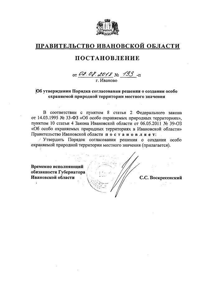 Постановление Правительства Ивановской области от 02.07.2018 N 193-п "Об утверждении Порядка согласования решения о создании особо охраняемой природной территории местного значения"