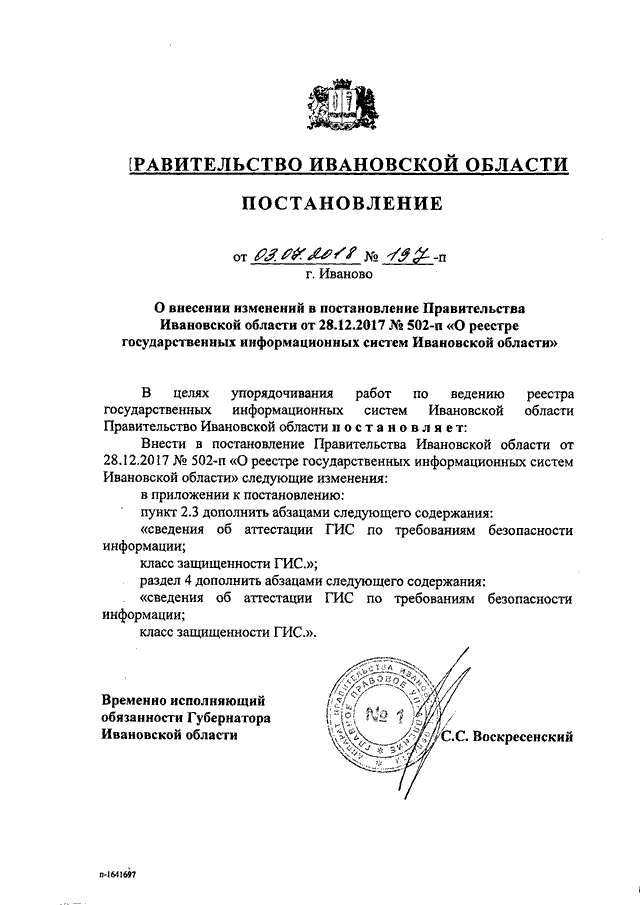 Постановление Правительства Ивановской области от 03.07.2018 N 197-п "О внесении изменений в постановление Правительства Ивановской области от 28.12.2017 N 502-п "О реестре государственных информационных систем Ивановской области"