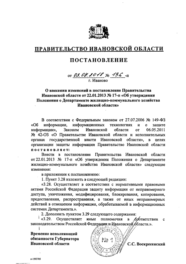 Постановление Правительства Ивановской области от 03.07.2018 N 196-п "О внесении изменений в постановление Правительства Ивановской области от 22.01.2013 N 17-п "Об утверждении Положения о Департаменте жилищно-коммунального хозяйства Ивановской области"