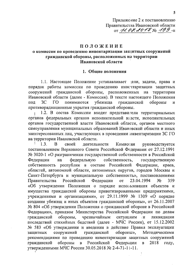 Постановление Правительства Ивановской области от 11.07.2018 N 199-п "О создании комиссии по проведению инвентаризации защитных сооружений гражданской обороны, расположенных на территории Ивановской области" (вместе с "Положением о комиссии по проведению инвентаризации защитных сооружений гражданской обороны, расположенных на территории Ивановской области")
