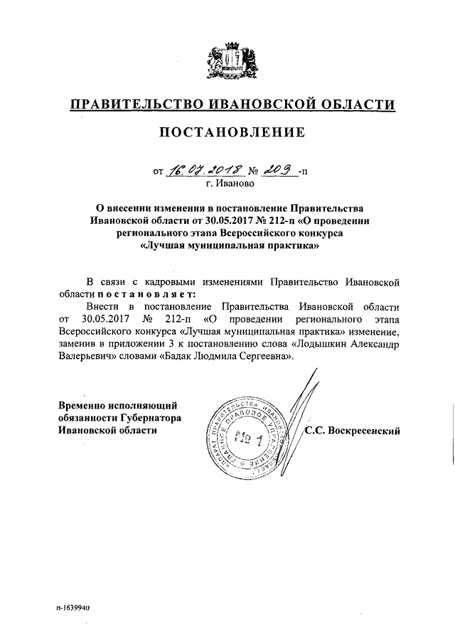 Постановление Правительства Ивановской области от 16.07.2018 N 209-п "О внесении изменения в постановление Правительства Ивановской области от 30.05.2017 N 212-п "О проведении регионального этапа Всероссийского конкурса "Лучшая муниципальная практика"