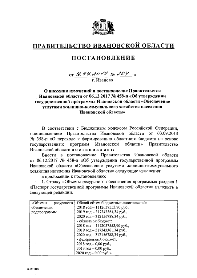 Постановление Правительства Ивановской области от 16.07.2018 N 204-п "О внесении изменений в постановление Правительства Ивановской области от 06.12.2017 N 458-п "Об утверждении государственной программы Ивановской области "Обеспечение услугами жилищно-коммунального хозяйства населения Ивановской области"