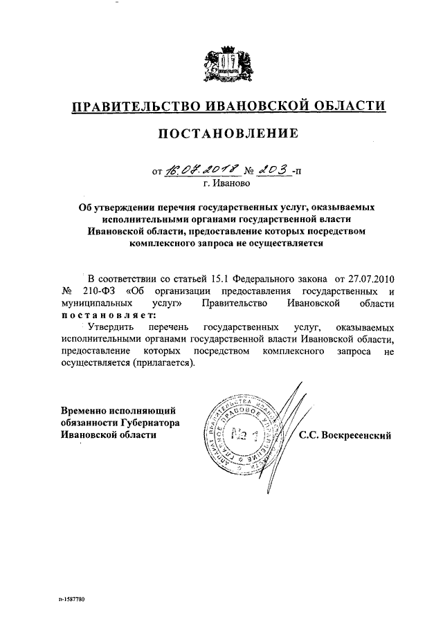 Постановление Правительства Ивановской области от 16.07.2018 N 203-п "Об утверждении перечня государственных услуг, оказываемых исполнительными органами государственной власти Ивановской области, предоставление которых посредством комплексного запроса не осуществляется"