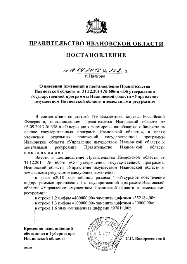 Постановление Правительства Ивановской области от 16.07.2018 N 202-п "О внесении изменений в постановление Правительства Ивановской области от 31.12.2014 N 606-п "Об утверждении государственной программы Ивановской области "Управление имуществом Ивановской области и земельными ресурсами"