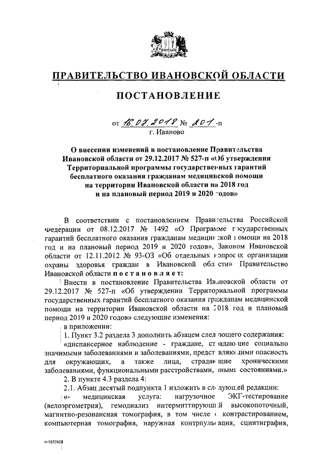 Постановление Правительства Ивановской области от 16.07.2018 N 201-п "О внесении изменений в постановление Правительства Ивановской области от 29.12.2017 N 527-п "Об утверждении Территориальной программы государственных гарантий бесплатного оказания гражданам медицинской помощи на территории Ивановской области на 2018 год и на плановый период 2019 и 2020 годов"