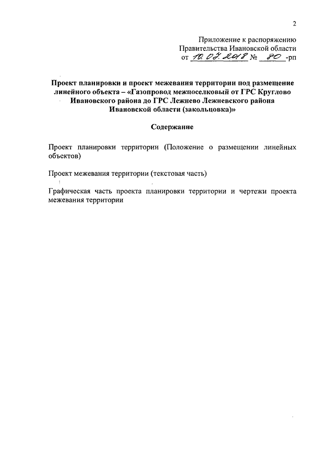 Распоряжение Правительства Ивановской области от 10.07.2018 N 80-рп "Об утверждении проекта планировки и проекта межевания территории под размещение линейного объекта - "Газопровод межпоселковый от ГРС Круглово Ивановского района до ГРС Лежнево Лежневского района Ивановской области (закольцовка)"