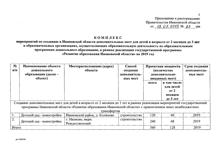 Распоряжение Правительства Ивановской области от 19.07.2018 N 83-рп "Об утверждении комплекса мероприятий по созданию в Ивановской области дополнительных мест для детей в возрасте от 2 месяцев до 3 лет в образовательных организациях, осуществляющих образовательную деятельность по образовательным программам дошкольного образования, в рамках реализации государственной программы "Развитие образования Ивановской области" на 2019 год"