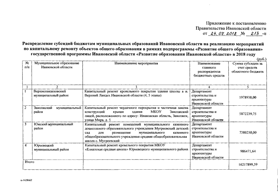 Постановление Правительства Ивановской области от 24.07.2018 N 213-п "О распределении субсидий бюджетам муниципальных образований Ивановской области на реализацию мероприятий по капитальному ремонту объектов общего образования в рамках подпрограммы "Развитие общего образования" государственной программы Ивановской области "Развитие образования Ивановской области" в 2018 году"