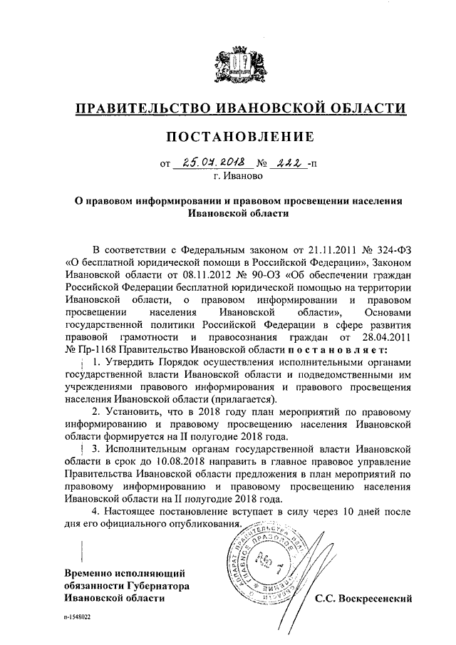Постановление Правительства Ивановской области от 25.07.2018 N 222-п "О правовом информировании и правовом просвещении населения Ивановской области" (вместе с "Порядком осуществления исполнительными органами государственной власти Ивановской области и подведомственными им учреждениями правового информирования и правового просвещения населения Ивановской области")