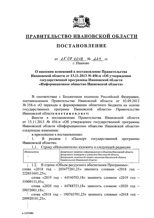 Постановление Правительства Ивановской области от 25.07.2018 N 224-п "О внесении изменений в постановление Правительства Ивановской области от 13.11.2013 N 456-п "Об утверждении государственной программы Ивановской области "Информационное общество Ивановской области"