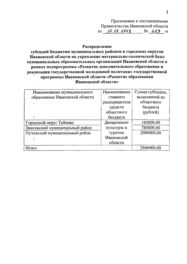 Постановление Правительства Ивановской области от 30.07.2018 N 229-п "О распределении субсидий бюджетам муниципальных районов и городских округов Ивановской области на укрепление материально-технической базы муниципальных образовательных организаций Ивановской области в рамках подпрограммы "Развитие дополнительного образования и реализация государственной молодежной политики" государственной программы Ивановской области "Развитие образования Ивановской области"