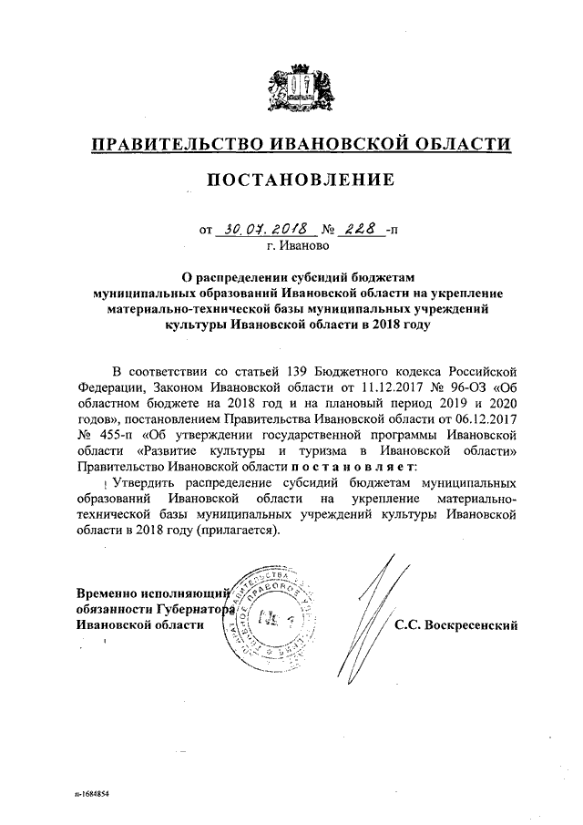 Постановление Правительства Ивановской области от 30.07.2018 N 228-п "О распределении субсидий бюджетам муниципальных образований Ивановской области на укрепление материально-технической базы муниципальных учреждений культуры Ивановской области в 2018 году"