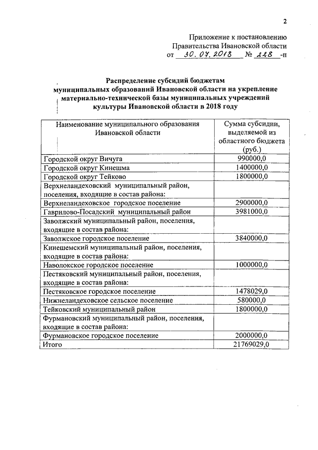 Постановление Правительства Ивановской области от 30.07.2018 N 228-п "О распределении субсидий бюджетам муниципальных образований Ивановской области на укрепление материально-технической базы муниципальных учреждений культуры Ивановской области в 2018 году"