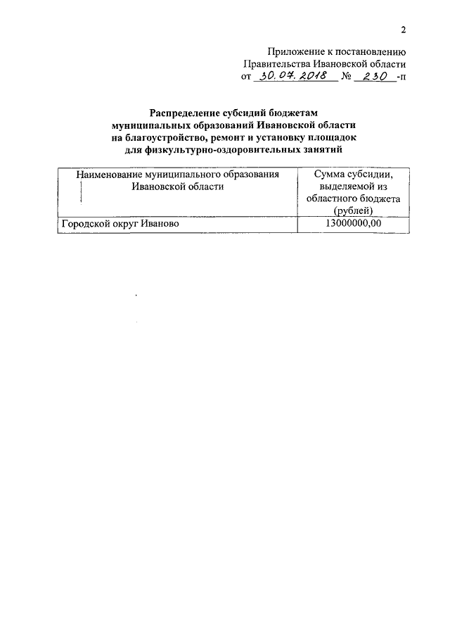 Постановление Правительства Ивановской области от 30.07.2018 N 230-п "О распределении субсидий бюджетам муниципальных образований Ивановской области на благоустройство, ремонт и установку площадок для физкультурно-оздоровительных занятий"