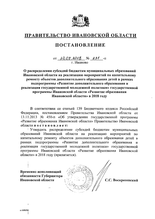 Постановление Правительства Ивановской области от 30.07.2018 N 231-п "О распределении субсидий бюджетам муниципальных образований Ивановской области на реализацию мероприятий по капитальному ремонту объектов дополнительного образования детей в рамках подпрограммы "Развитие дополнительного образования и реализация государственной молодежной политики" государственной программы Ивановской области "Развитие образования Ивановской области" в 2018 году"