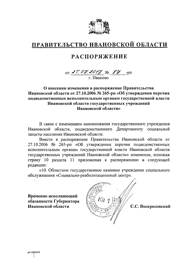 Распоряжение Правительства Ивановской области от 25.07.2018 N 87-рп "О внесении изменения в распоряжение Правительства Ивановской области от 27.10.2006 N 265-рп "Об утверждении перечня подведомственных исполнительным органам государственной власти Ивановской области государственных учреждений Ивановской области"