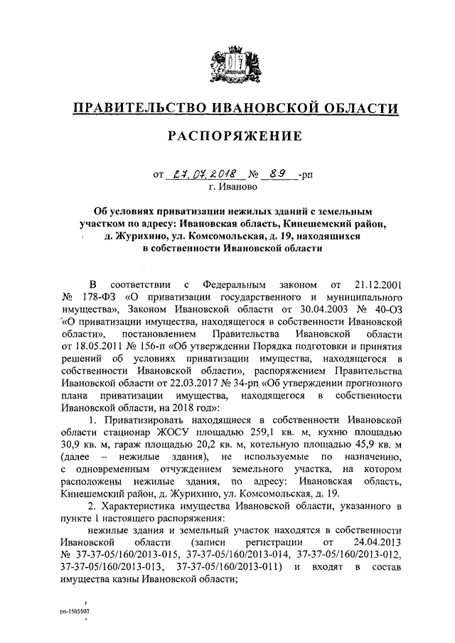 Распоряжение Правительства Ивановской области от 27.07.2018 N 89-рп "Об условиях приватизации нежилых зданий с земельным участком по адресу: Ивановская область, Кинешемский район, д. Журихино, ул. Комсомольская, д. 19, находящихся в собственности Ивановской области"